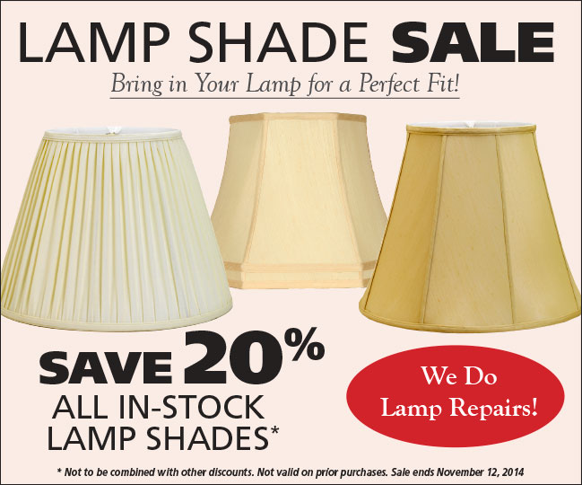Lamp Shade Sale Save 20% all in-stock shades now through November 12, 2014! Bring In Your Lamp for a Perfect Fit We do Lamp Repairs! adcola2017-05-19T10:42:16-04:00 Share This Story, Choose Your Platform! FacebookXRedditLinkedInTumblrPinterestVkEmail